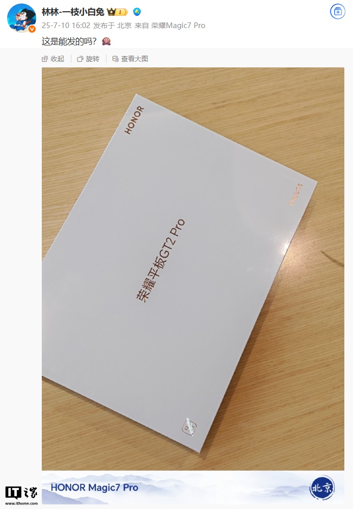 据Home称,7月10日,荣誉中国副总裁兼Smart Life Business Department总监Lin Lin今天介绍了新的Weibo Tablet Product。预计将在不久的将来推出。产品包装盒显示,荣誉平板电脑GT2 Pro已预先安装在魔术系统(预计将为9.0或更高)中,并配备了12英寸或更多的屏幕(Blogger @wangzai Pepsi透露GT2 Pro Table Gen3和3K的3K和12.3英寸的3K英寸为144Hz(3000×1920年)Oled Scond。