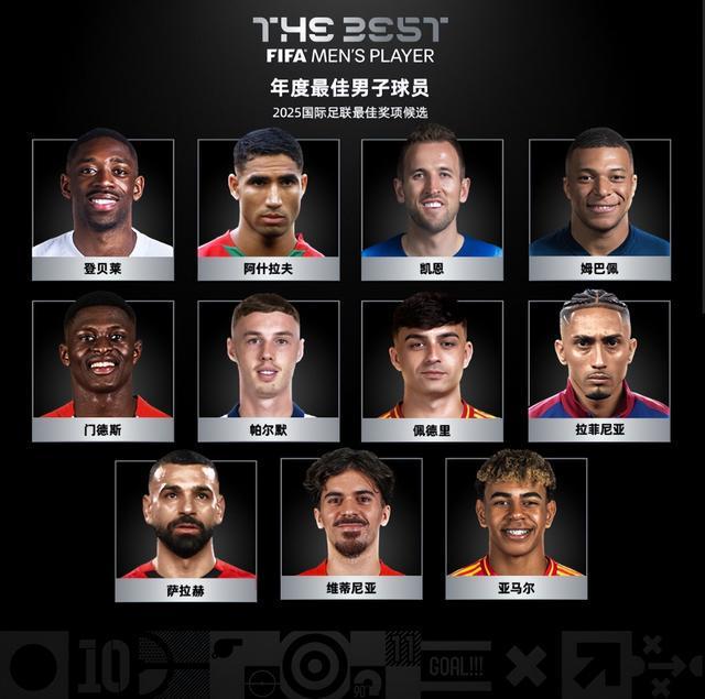 11月7日,国际足联公布了2025年度最佳球员奖的11名候选人。登贝莱、姆巴佩、亚马尔和凯恩都在名单上,但曼城的哈兰德入选的可能性不大。在11名候选人中,上赛季欧冠冠军巴黎圣日耳曼球员将占据四席,巴塞罗那球员将占据三席。没有人选择上赛季欧冠亚军国际米兰。其他入选的四名球员分别是萨拉赫、凯恩、帕尔默和姆巴佩。候选人名单如下: 奥斯曼·登贝莱(法国/巴黎圣日耳曼) 阿什拉夫·哈基米(摩洛哥/巴黎圣日耳曼) 哈里·凯恩(英格兰/拜仁慕尼黑) 基利安·姆巴佩(法国/皇家马德里) 努诺·门德斯(葡萄牙/巴黎圣日耳曼) 科尔·帕尔默(英格兰/切尔西) 佩德里(西班牙)/巴塞罗那拉菲尼亚(巴西/巴塞罗那) 穆罕默德·萨拉赫(埃及/利物浦) 维蒂尼亚·费雷拉(葡萄牙/巴黎圣日耳曼) 拉明·亚马尔(西班牙/巴塞罗那) 国际足联年度最佳球员奖的评选周期是表演2024年8月11日至2025年8月2日的球员。2024年该奖项的获得者是皇马前锋维尼修斯。同日公布的年度提名名单还包括最佳球员、最佳男队、最佳女队、最佳男足球教练、最佳女足球教练、最佳女守门员、最佳男守门员和最佳球迷的提名。来源:央视、@FIFA